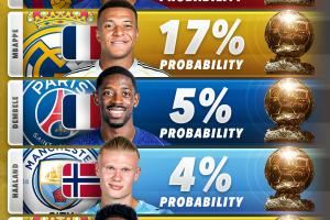 🏆外媒列2026金球概率:亚马尔18%领跑,姆巴佩17%,登贝莱5%